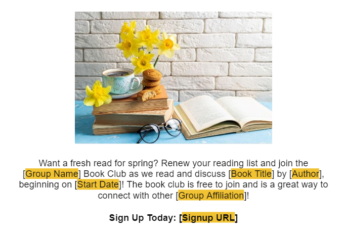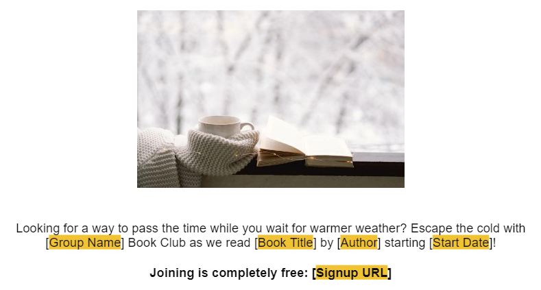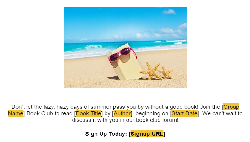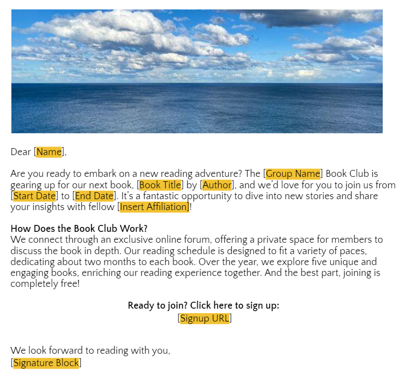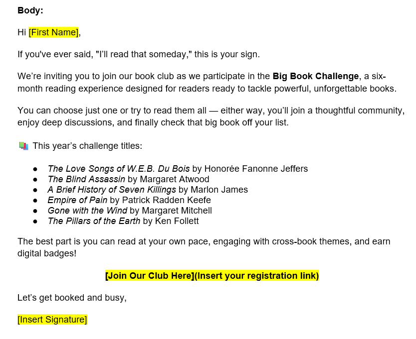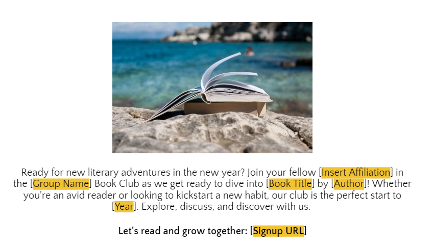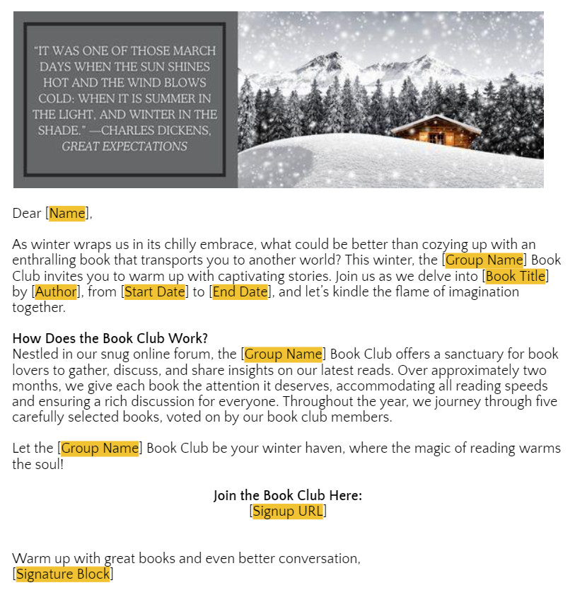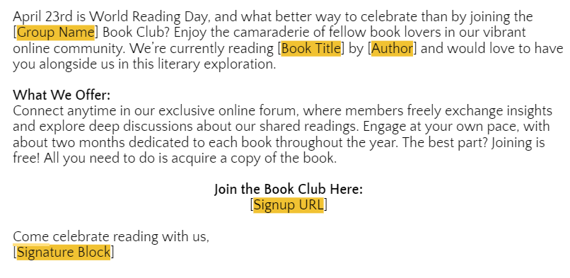 While promoting before the reading period is not mandatory, we strongly recommend taking advantage of this opportunity to attract new readers and foster active participation in your book club forum. We recommend scheduling a stand-alone email communication 20-30 days before a new reading period starts. This timing will allow potential members ample time to acquire the book and join us on our literary journey. To review our universal reading schedule for each reading period, please click here.
