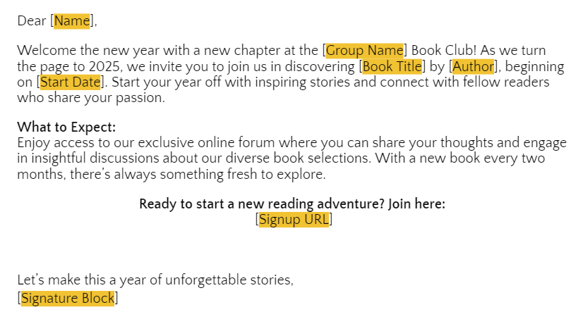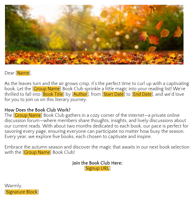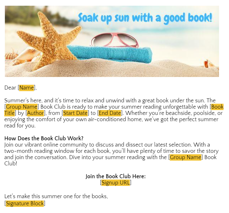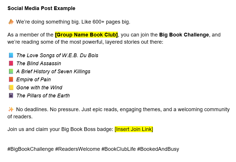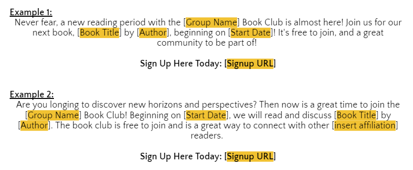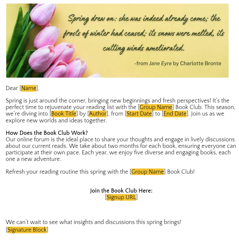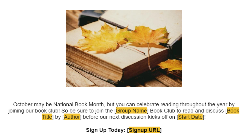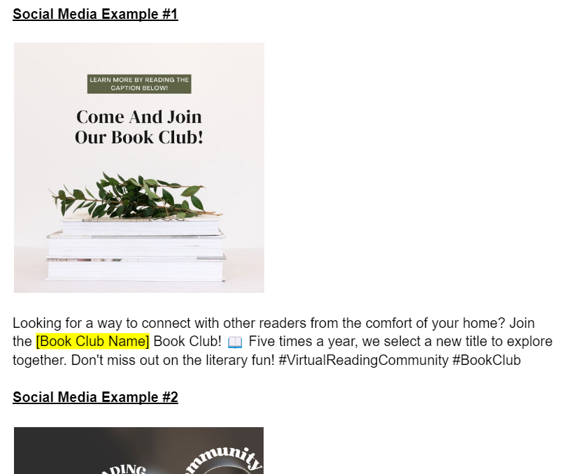 While promoting before the reading period is not mandatory, we strongly recommend taking advantage of this opportunity to attract new readers and foster active participation in your book club forum. We recommend scheduling a stand-alone email communication 20-30 days before a new reading period starts. This timing will allow potential members ample time to acquire the book and join us on our literary journey. To review our universal reading schedule for each reading period, please click here.