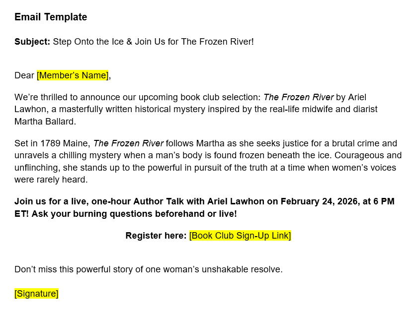 We will post downloadable material before each reading period so that you can send out your own marketing and promote the upcoming author talks.